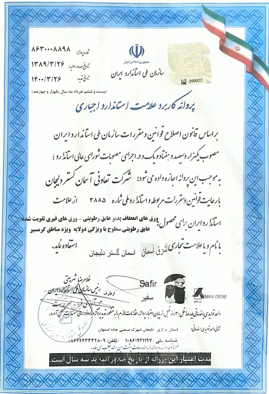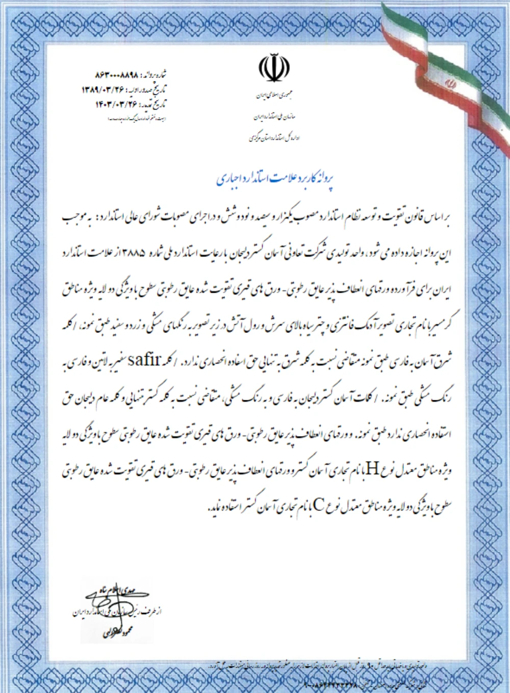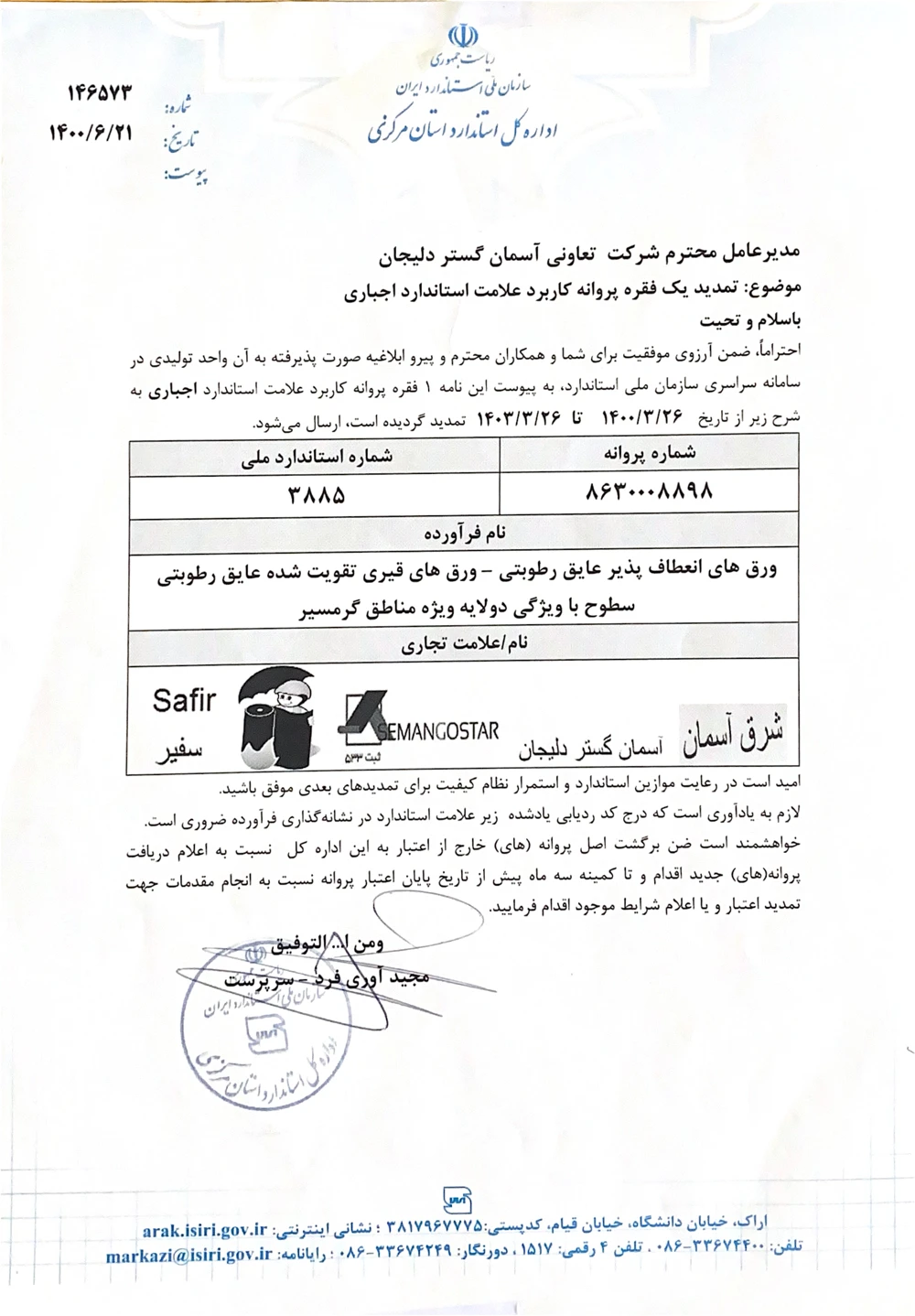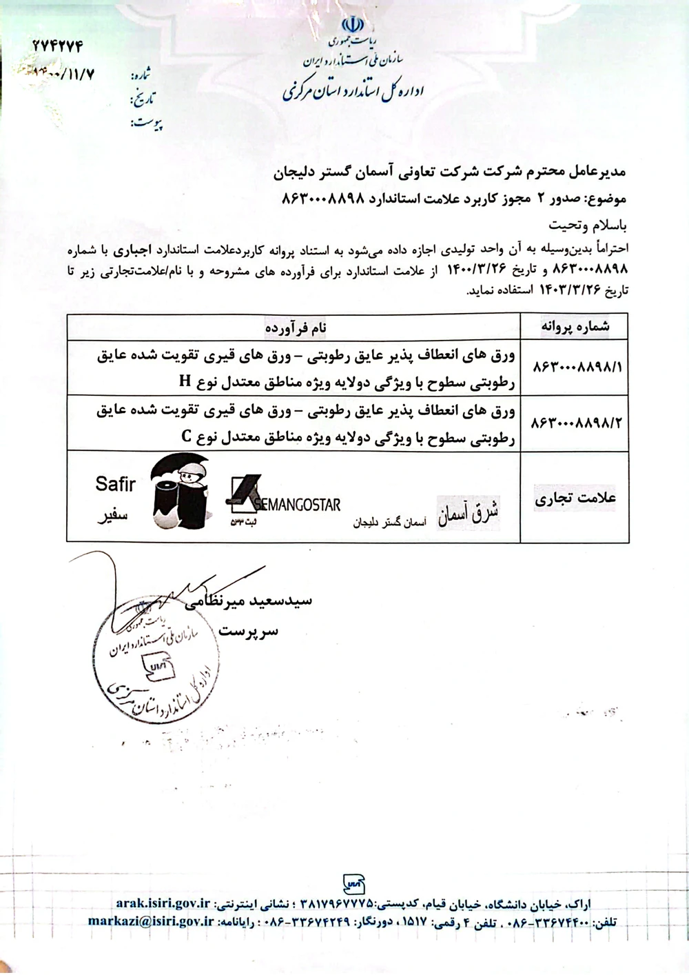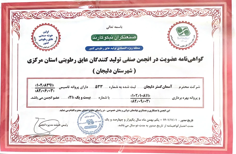 این بخش کلیه مجوزهای قانونی، پروانه بهرهبرداری، گواهیهای کیفیت و مدارک تأییدیه شرکت آسمان گستر دلیجان ارائه شده است. تمامی فعالیتهای تولیدی این مجموعه زیر نظر سازمانهای ذیربط و با رعایت استانداردهای مصوب انجام میشود. شما میتوانید در این صفحه، نسخه معتبر مجوزها و پروانههای رسمی کارخانه را مشاهده و بررسی کنید.